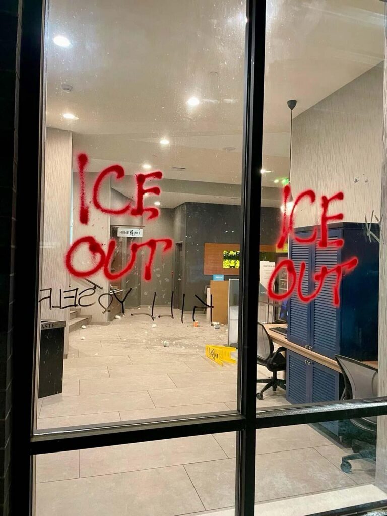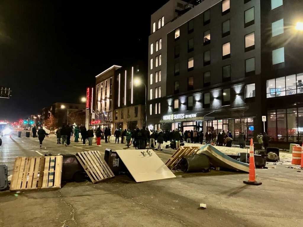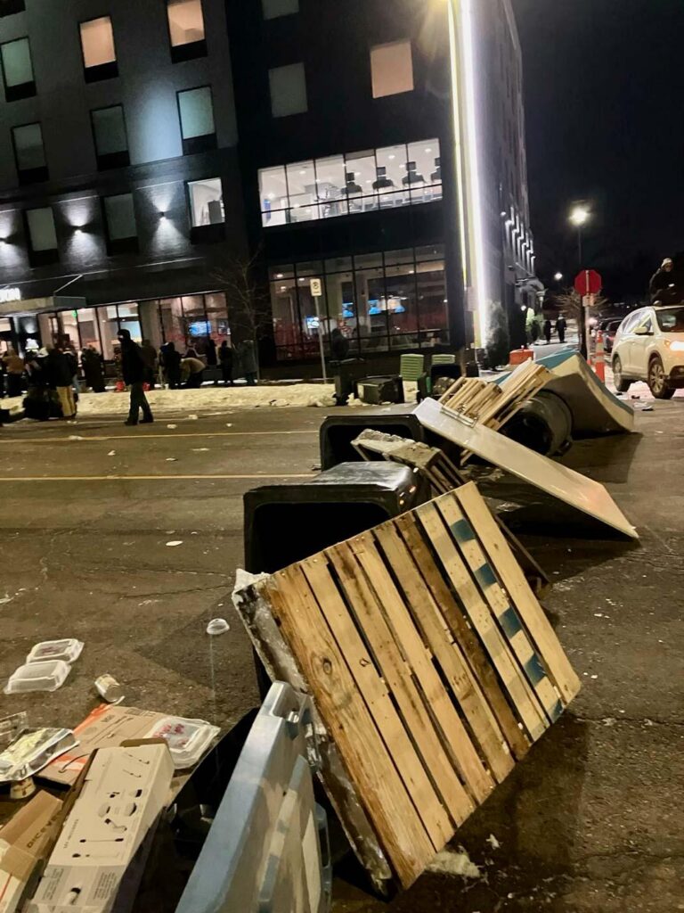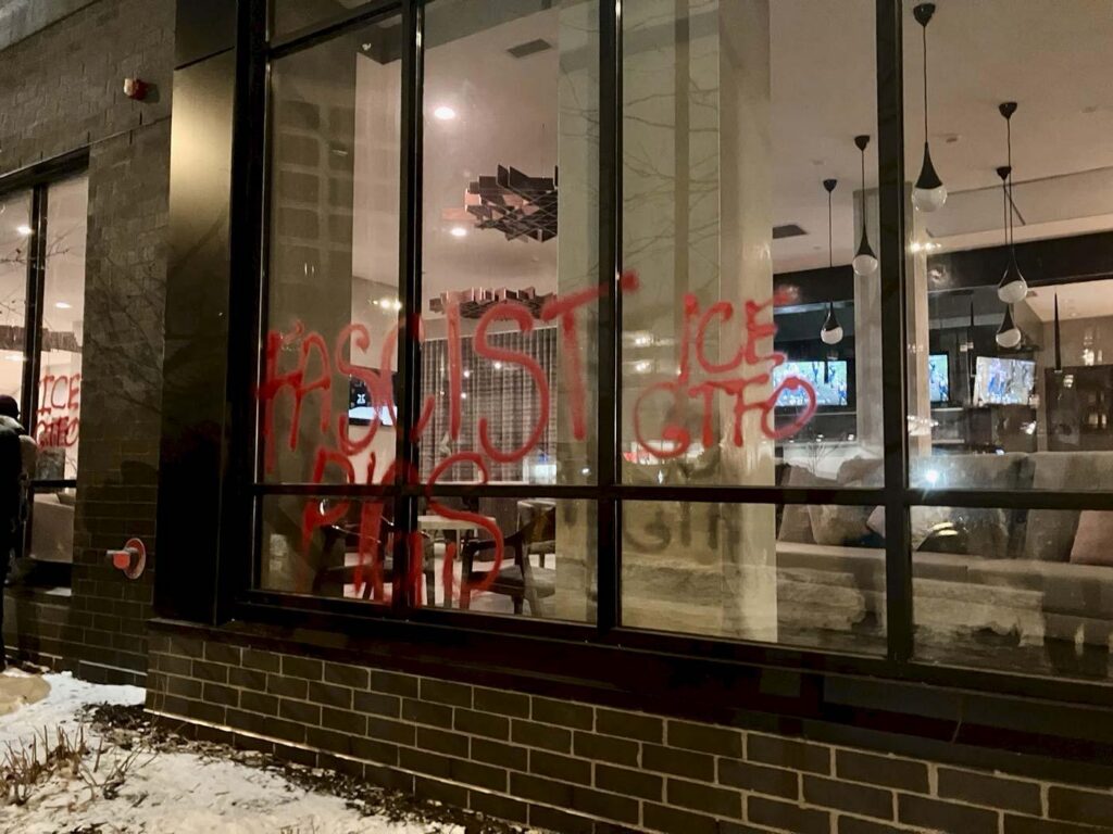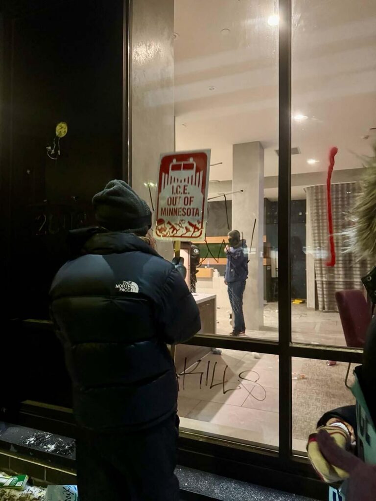 Die Teilnehmer*innen der Lärmdemonstration vom 25. Januar hatten sich Notizen darüber gemacht, was auf den Straßen funktioniert hatte. Die Zusammenstöße, die am 24. Januar zur Entstehung des Alex-Pretti-Platzes führten, waren durch die rasche Verbreitung von Barrikaden gekennzeichnet. In der Nacht des 25. Januar, als ich sehen konnte, was im Home2 Suites an der University Avenue vor sich ging, waren Mülltonnen, Holzpaletten und Matratzen auf die Straße gezogen worden, wodurch die University Avenue auf beiden Seiten des Hotels blockiert war. Die Demonstrant*innen machten viel Lärm. Mindestens ein Fenster wurde eingeschlagen, während die übrigen mit Botschaften wie „Fuck ICE, ICE Out!“ und „Killers stay here“ versehen wurden.