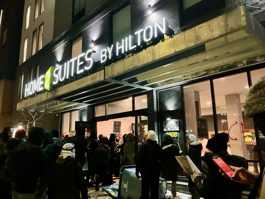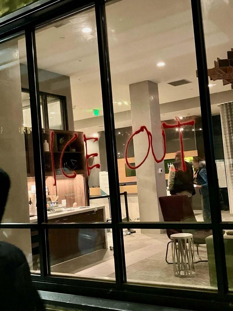 Zum ersten Mal betraten in Zivil gekleidete ICE-Bullen, die im Hotel wohnten, die Lobby mit vermummten Gesichtern, um den Tumult zu beobachten. Das machte die Leute noch wütender, und viele rannten zu den Türen und Fenstern, um die Besetzer*innen anzuschreien, gegen die Scheiben zu hämmern und ihnen mit Stroboskoplichtern in die Augen zu leuchten. Als einer der Bullen versuchte, die Leute zu provozieren, indem er sich auf seinem Handy Basketball-Highlights anschaute, schrie ein Demonstrant*in: „Du guckst Werbung, du kaputter Arsch! Bring dich um!“ Der Bulle verschwand kurz darauf in seinem Zimmer.