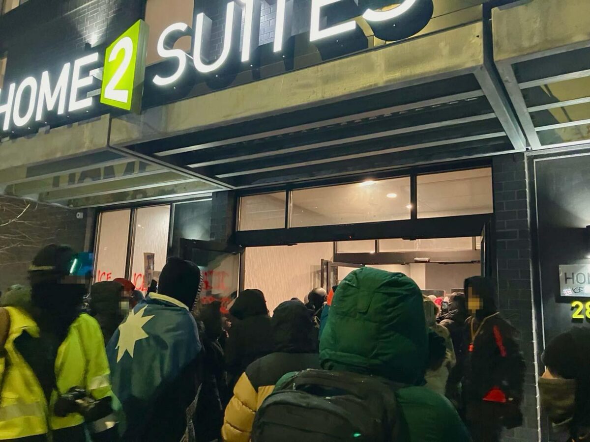 Zum ersten Mal betraten in Zivil gekleidete ICE-Bullen, die im Hotel wohnten, die Lobby mit vermummten Gesichtern, um den Tumult zu beobachten. Das machte die Leute noch wütender, und viele rannten zu den Türen und Fenstern, um die Besetzer*innen anzuschreien, gegen die Scheiben zu hämmern und ihnen mit Stroboskoplichtern in die Augen zu leuchten. Als einer der Bullen versuchte, die Leute zu provozieren, indem er sich auf seinem Handy Basketball-Highlights anschaute, schrie ein Demonstrant*in: „Du guckst Werbung, du kaputter Arsch! Bring dich um!“ Der Bulle verschwand kurz darauf in seinem Zimmer.